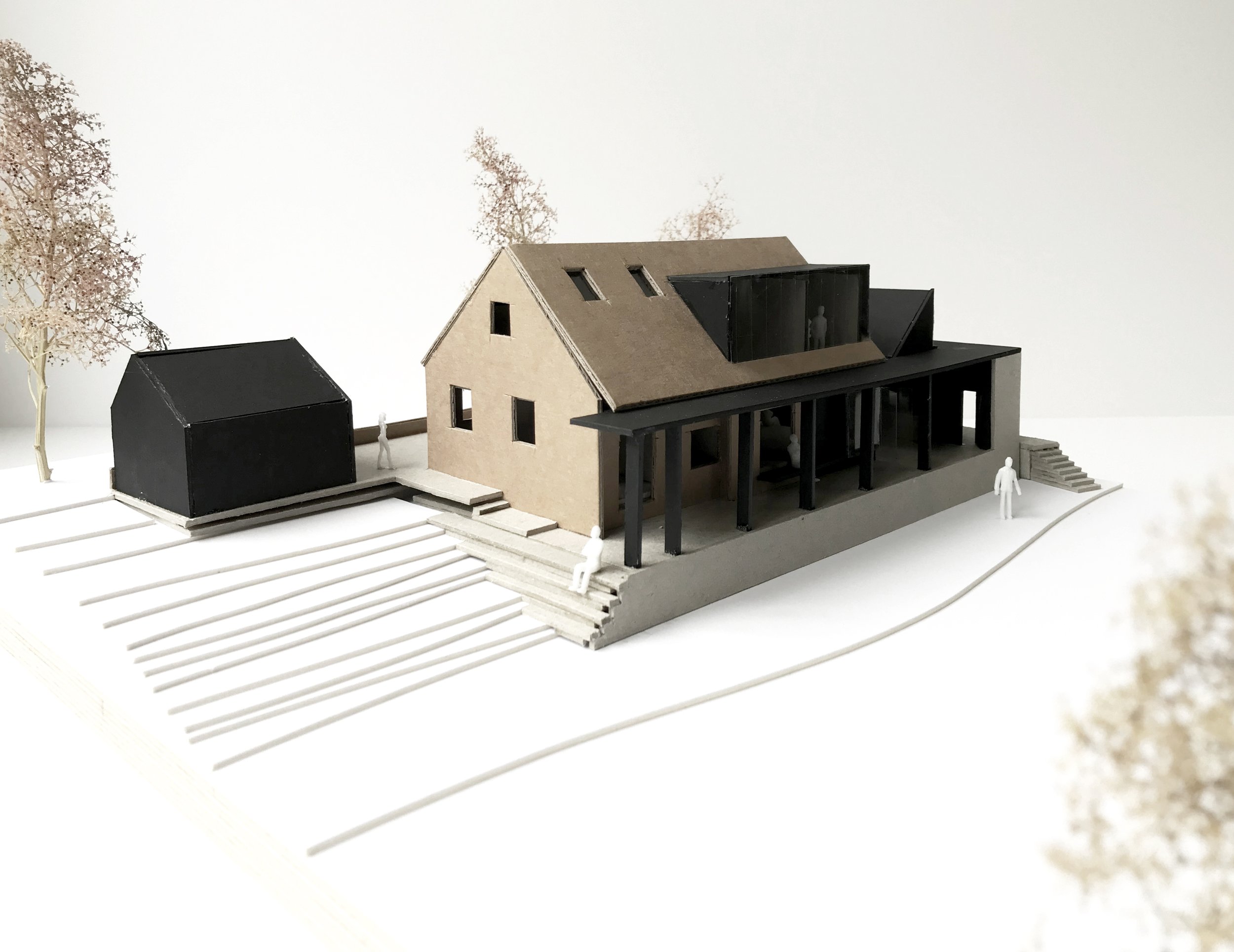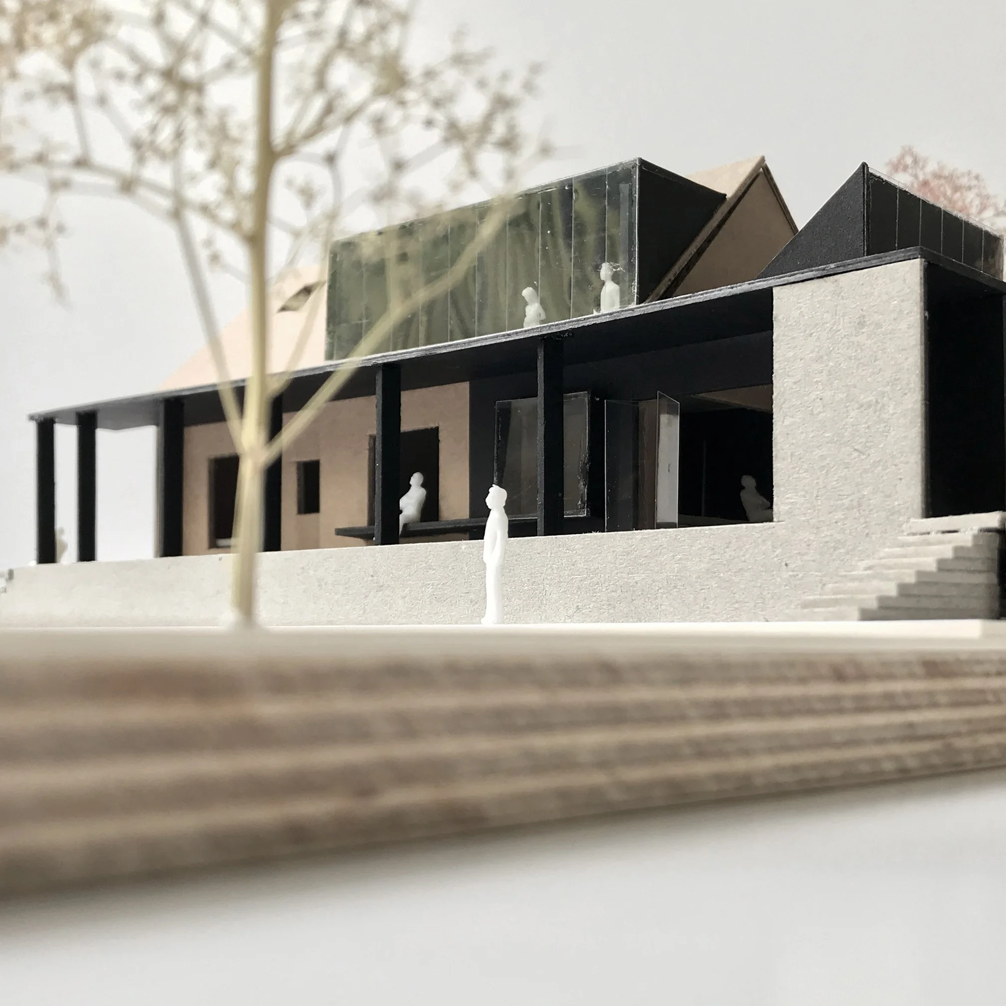 The Lowlands House comprises a full low energy refurbishment and extension of an existing red-brick bungalow in the Lower Wye Valley. The design includes a new entrance sequence, internal spatial reconfiguration, and a modern kitchen extension with direct access to a covered terrace. The roof was extended to create additional bedrooms, optimising views down the Wye Valley. Large glazed openings frame southern aspects, ensuring visual connection while maintaining privacy from the access road. Local materials — including a stone terrace plinth, matched brickwork, and charred timber cladding — integrate the extension seamlessly into its setting.