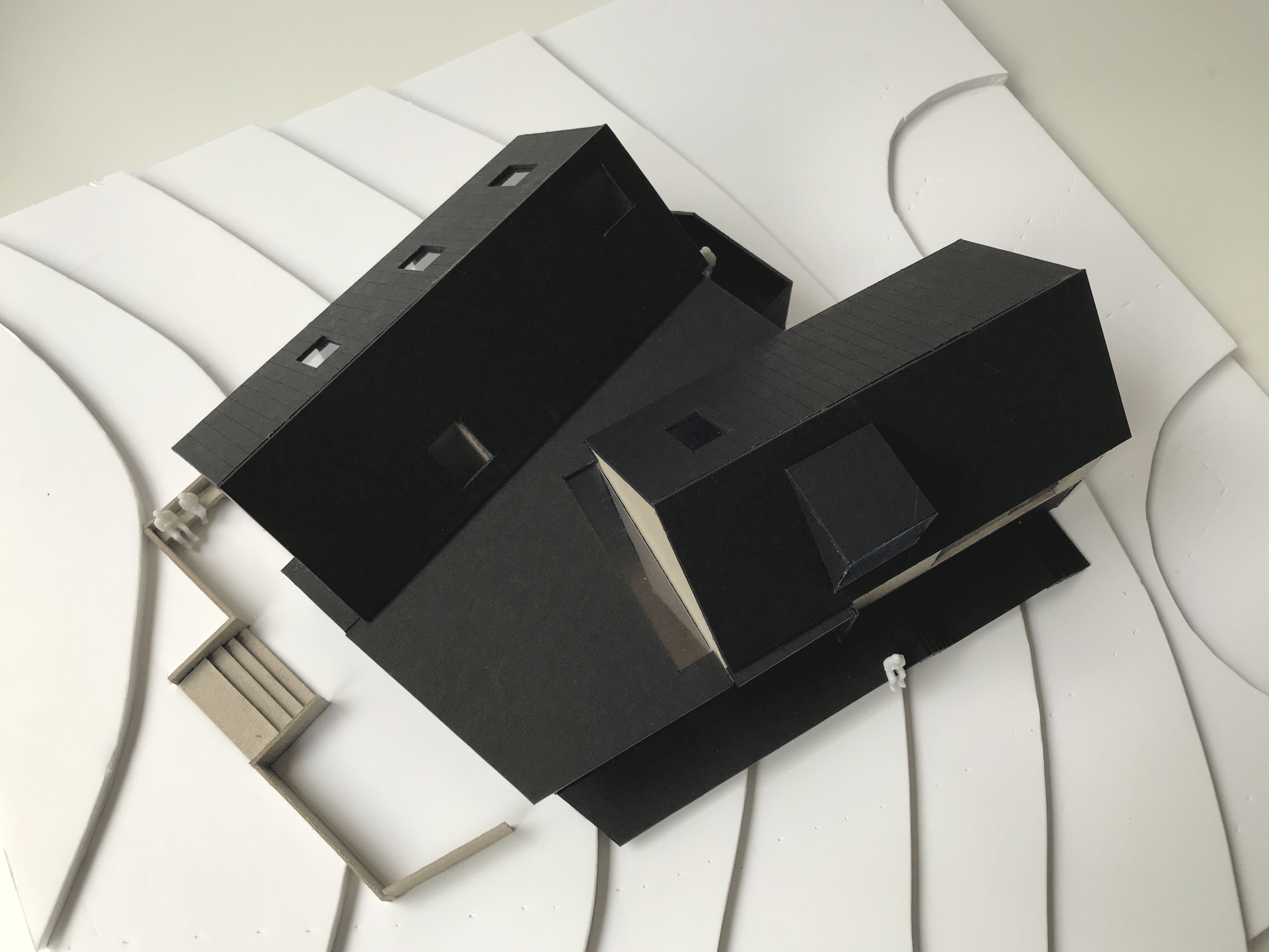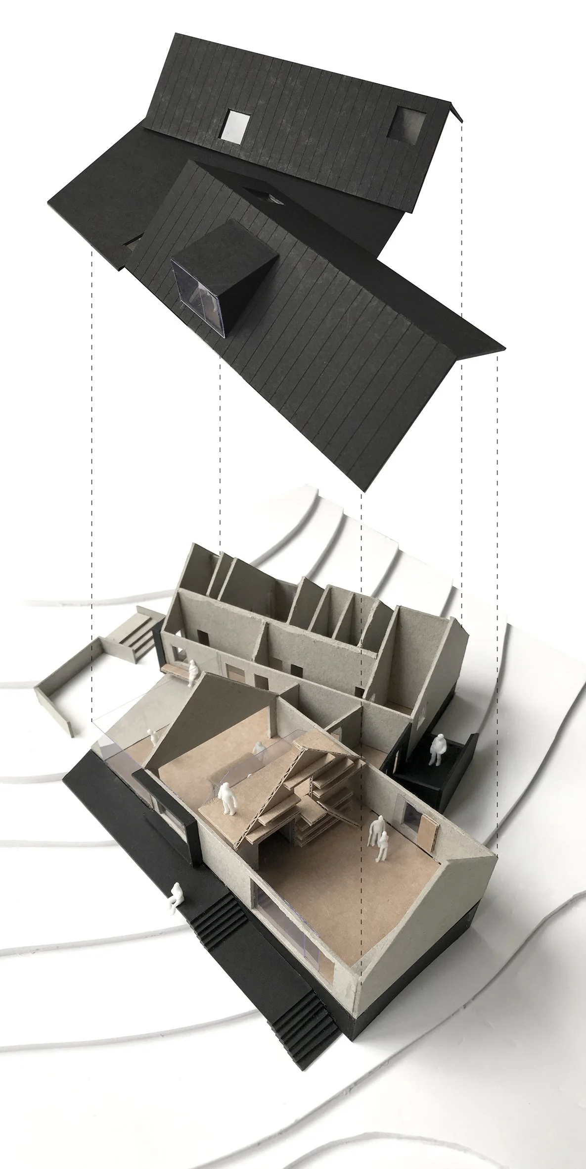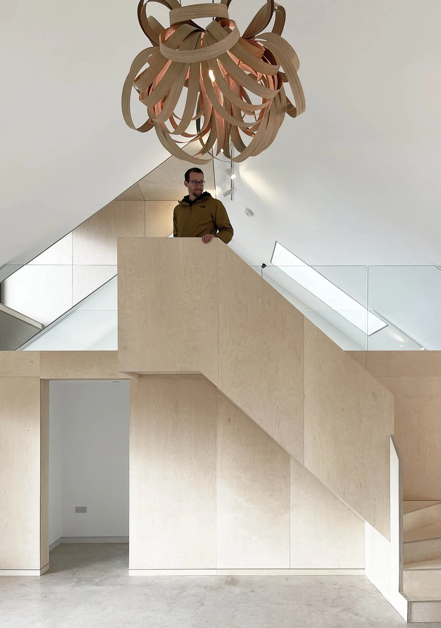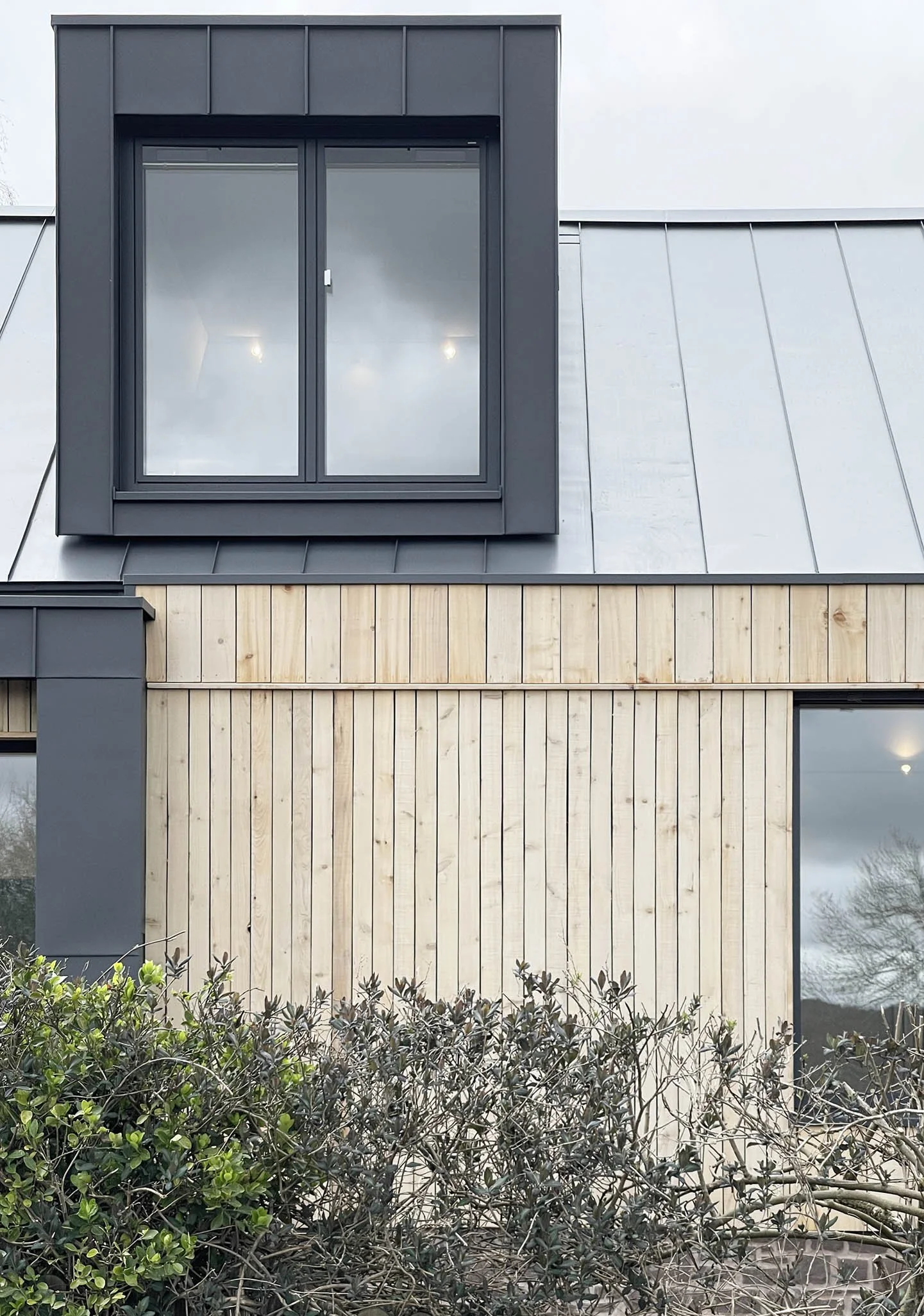 The Sunny House is a Passivhaus-standard refurbishment and extension of an existing timber bungalow in the Lower Wye Valley. The design introduces two cranked gabled volumes — separating private and shared functions — linked by a glazed, flat-roofed structure that connects home and garden. The internal layout maximises space and light, with open rooflines, integrated storage, and a mezzanine library above the kitchen. The home is timber-framed and clad, with a standing seam metal roof, and reorients site access to improve privacy and arrival.
