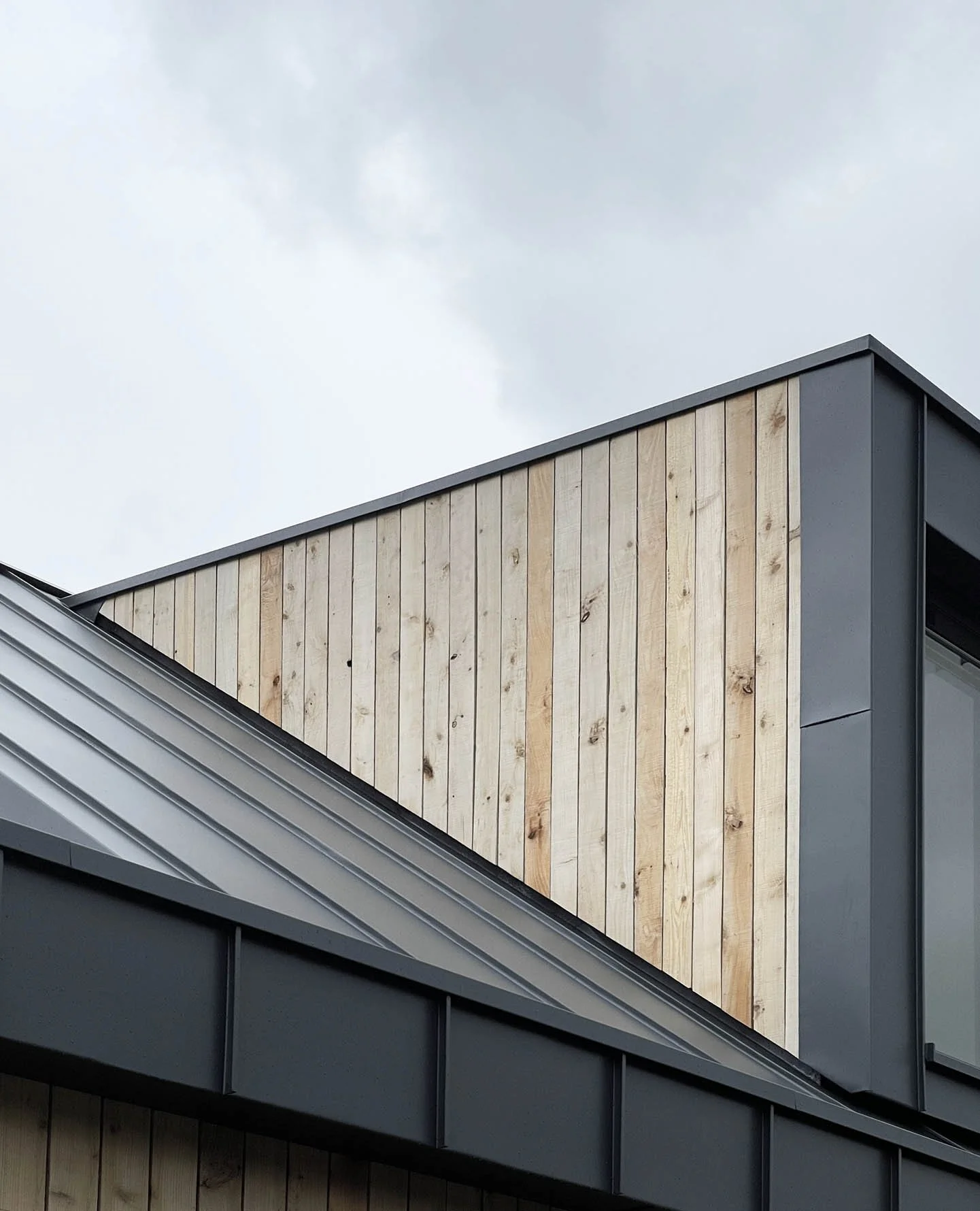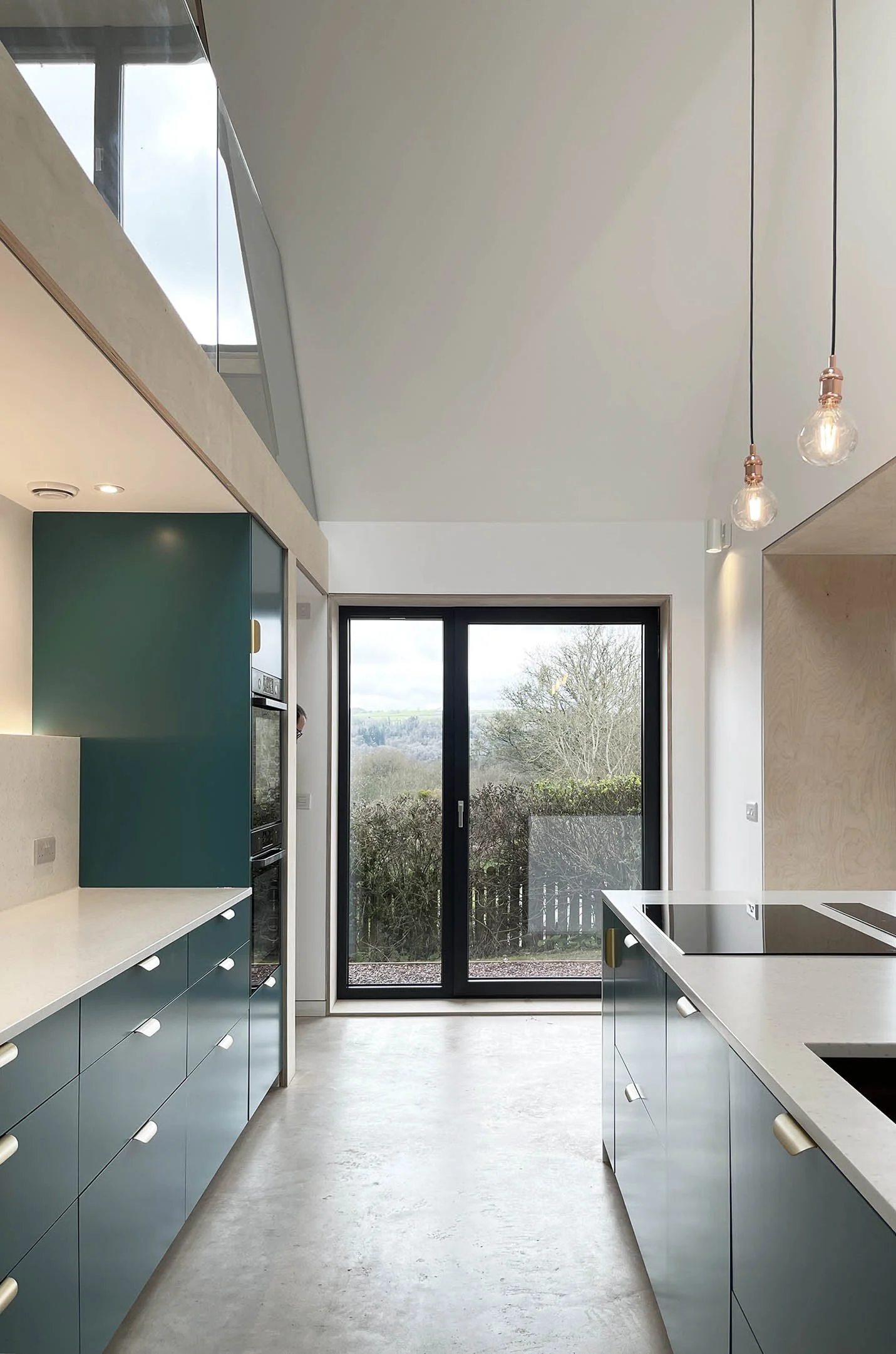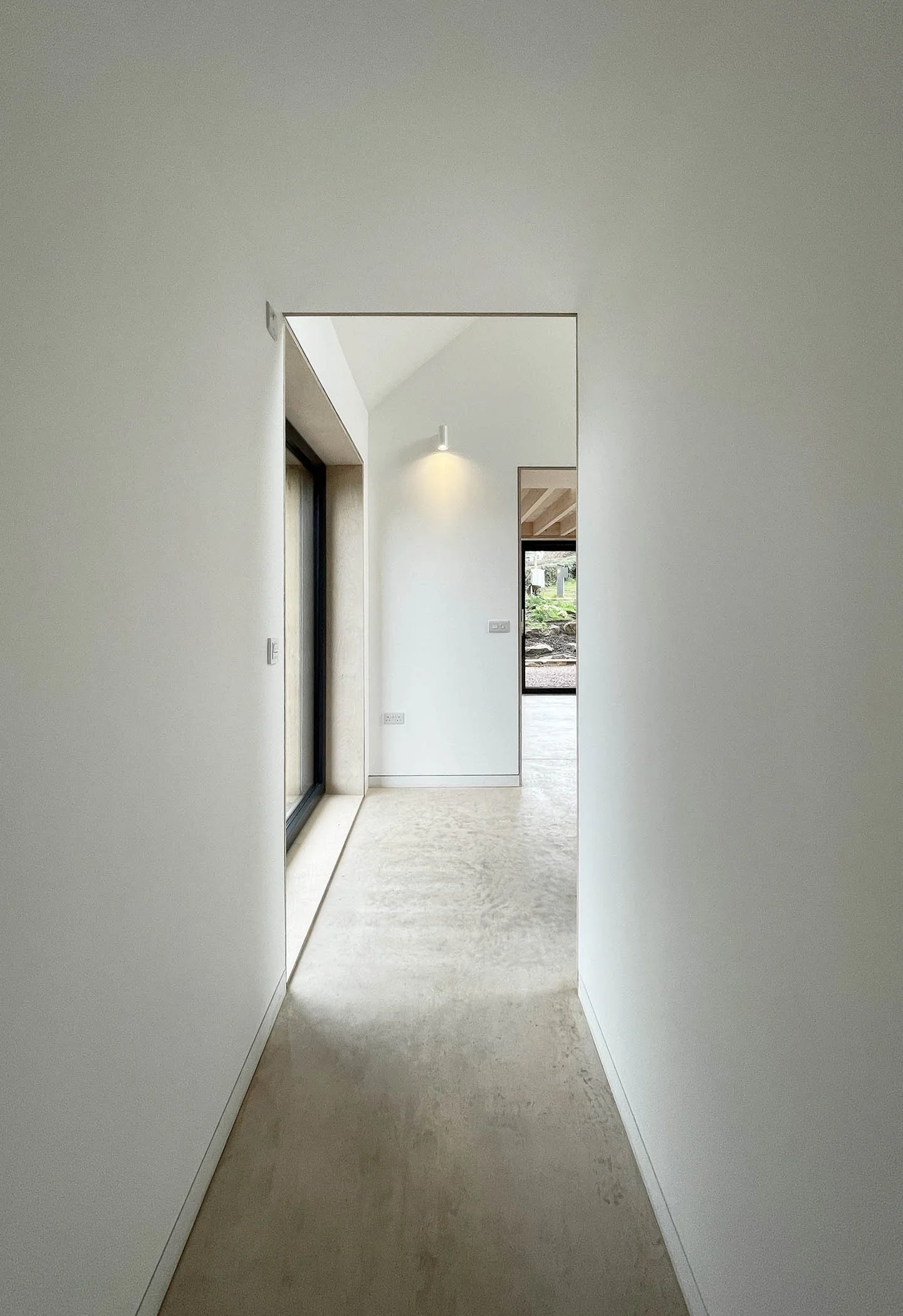 The home now unfolds across two cranked gabled forms, inspired by the silhouettes of nearby rural buildings. One holds bedrooms and private spaces, the other a flowing sequence for living, cooking, and gathering. A glazed link between them offers a moment of stillness — connecting inside to garden, and garden back to home — while allowing each form to breathe on its own.