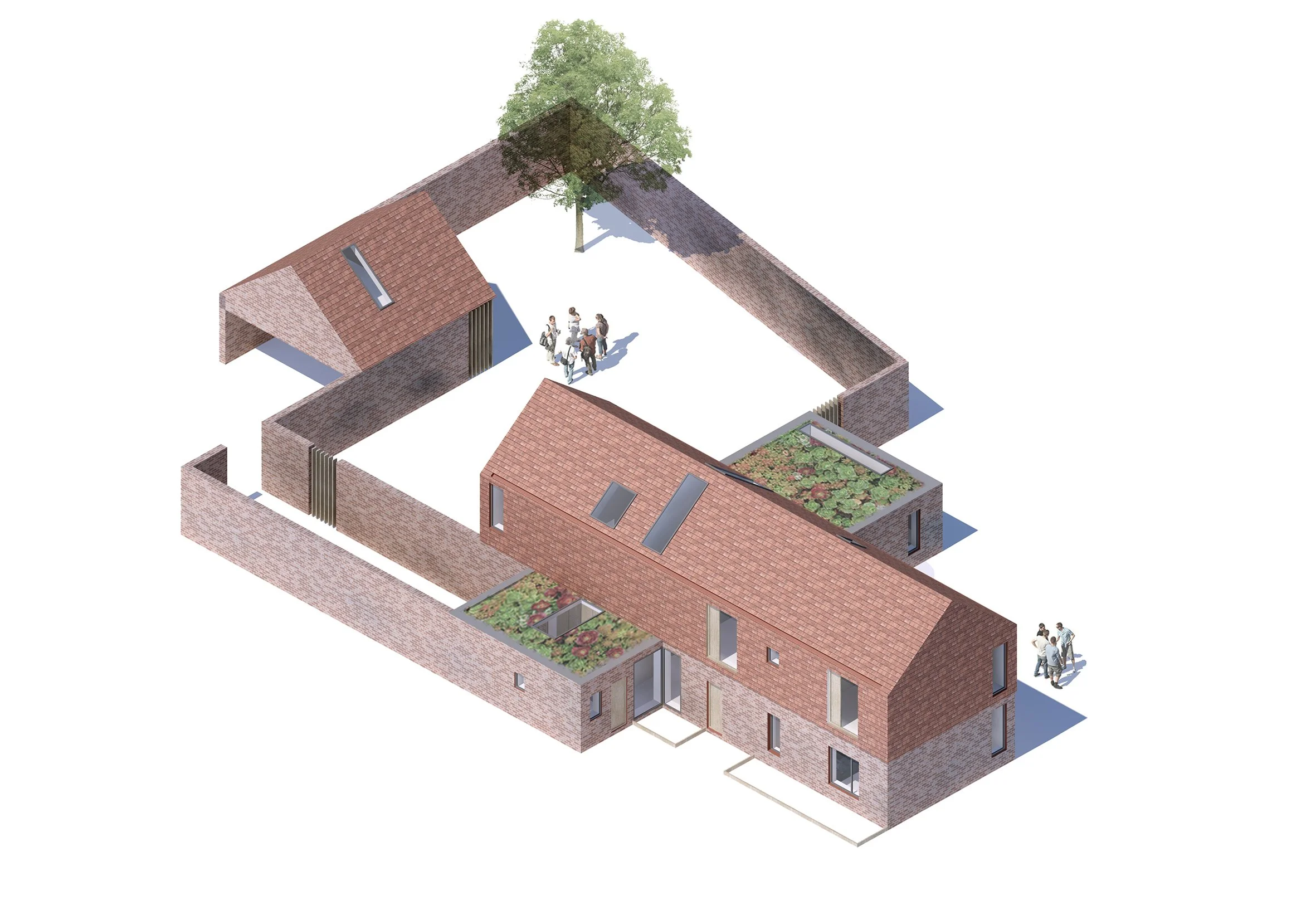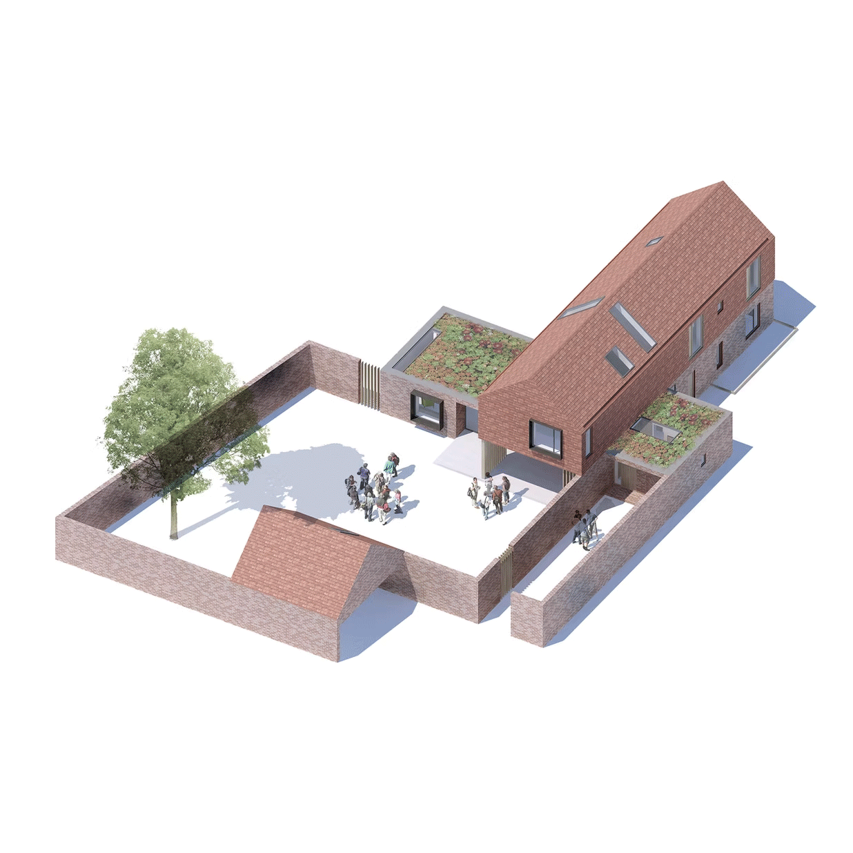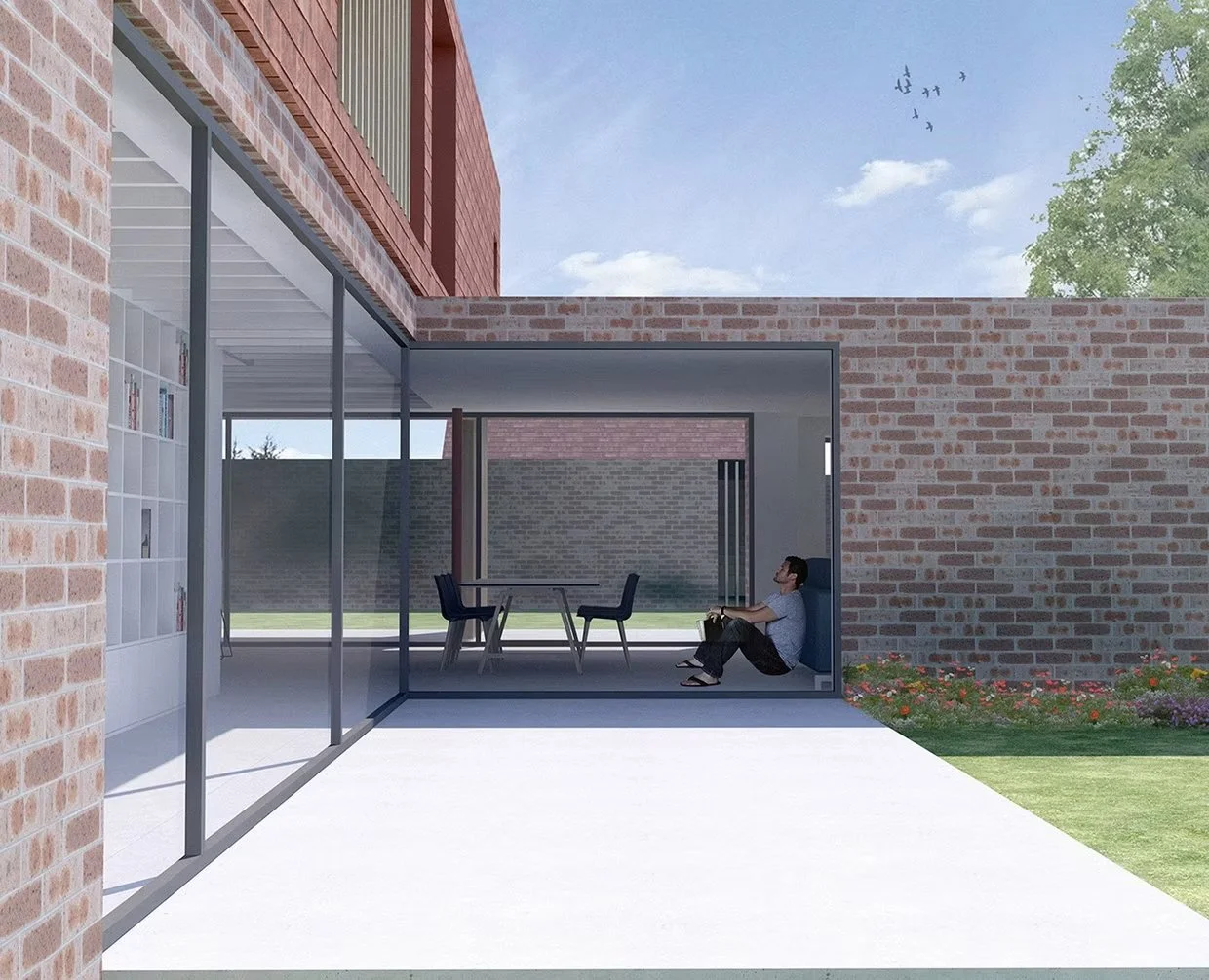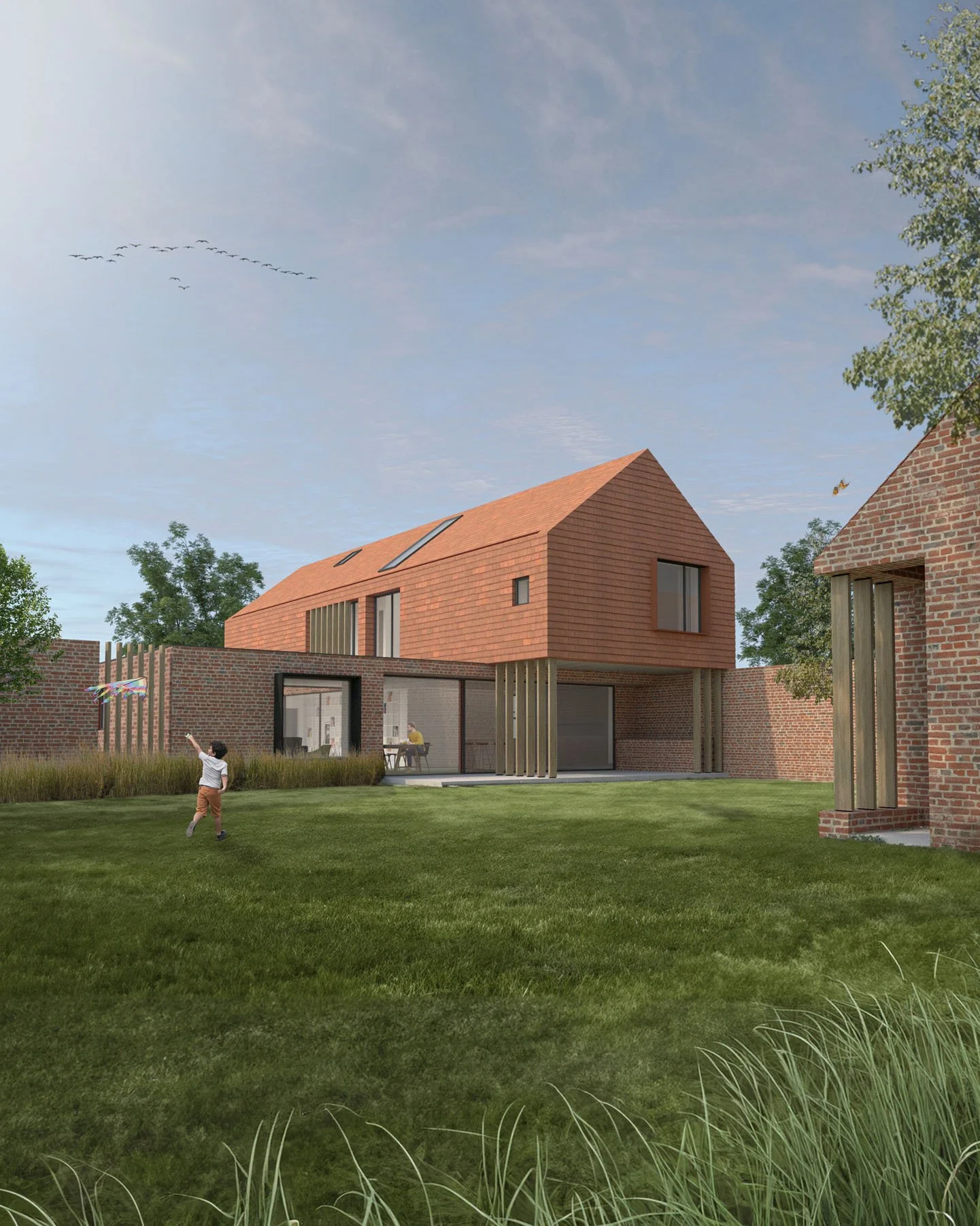The Broad Oak is a contemporary four-bedroom new-build house on a flat site in Gloucestershire. The proposal responds to local architectural language through the use of red brick, terracotta tones, and a prominent gable form referencing rural typologies. The design rotates the ground floor massing to create an L-shaped plan, forming a protected walled garden that connects directly to the main living spaces. The wall defines the entrance sequence and enhances privacy and acoustic protection from the adjacent road, while carefully framing south-facing garden views. Spatial sequencing and material selection were key to balancing contextual sensitivity with contemporary design expression.