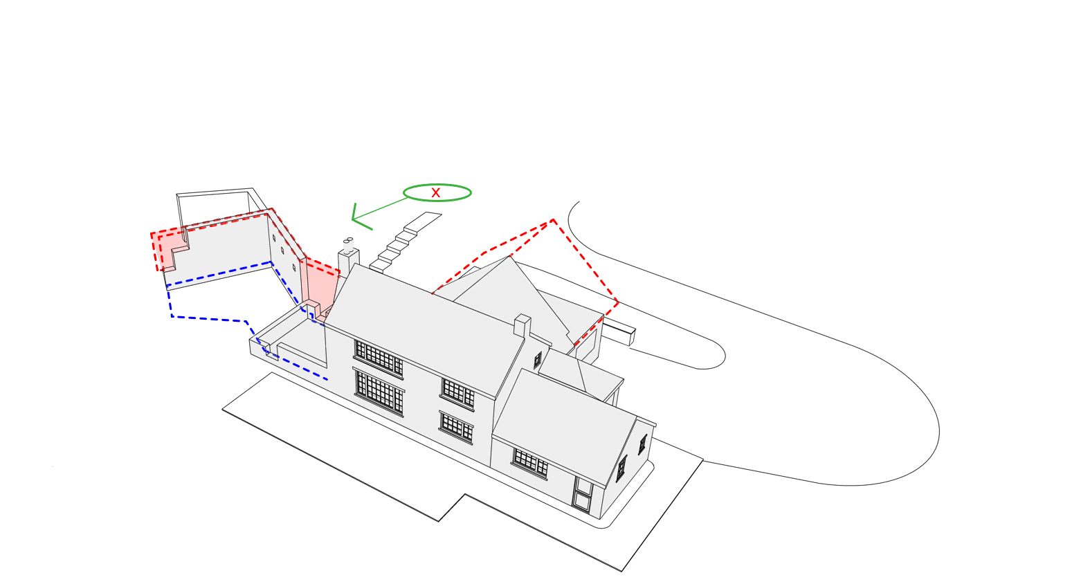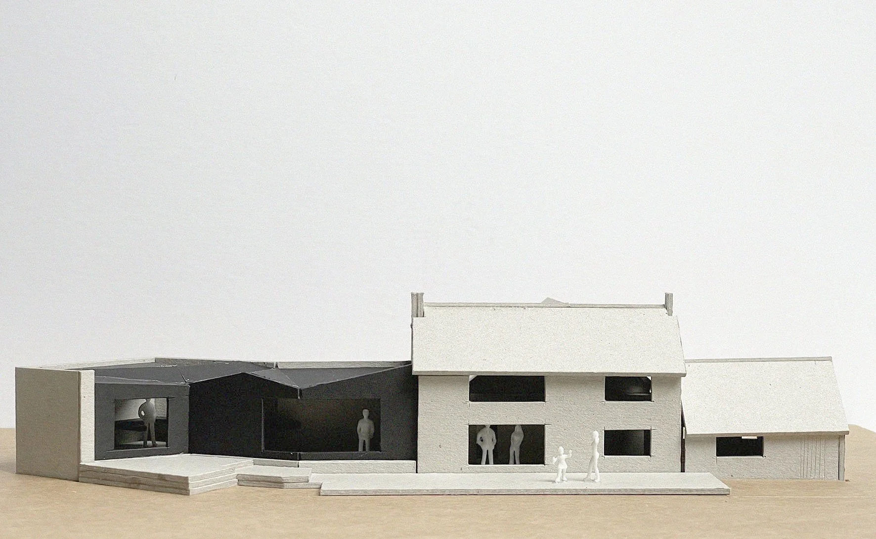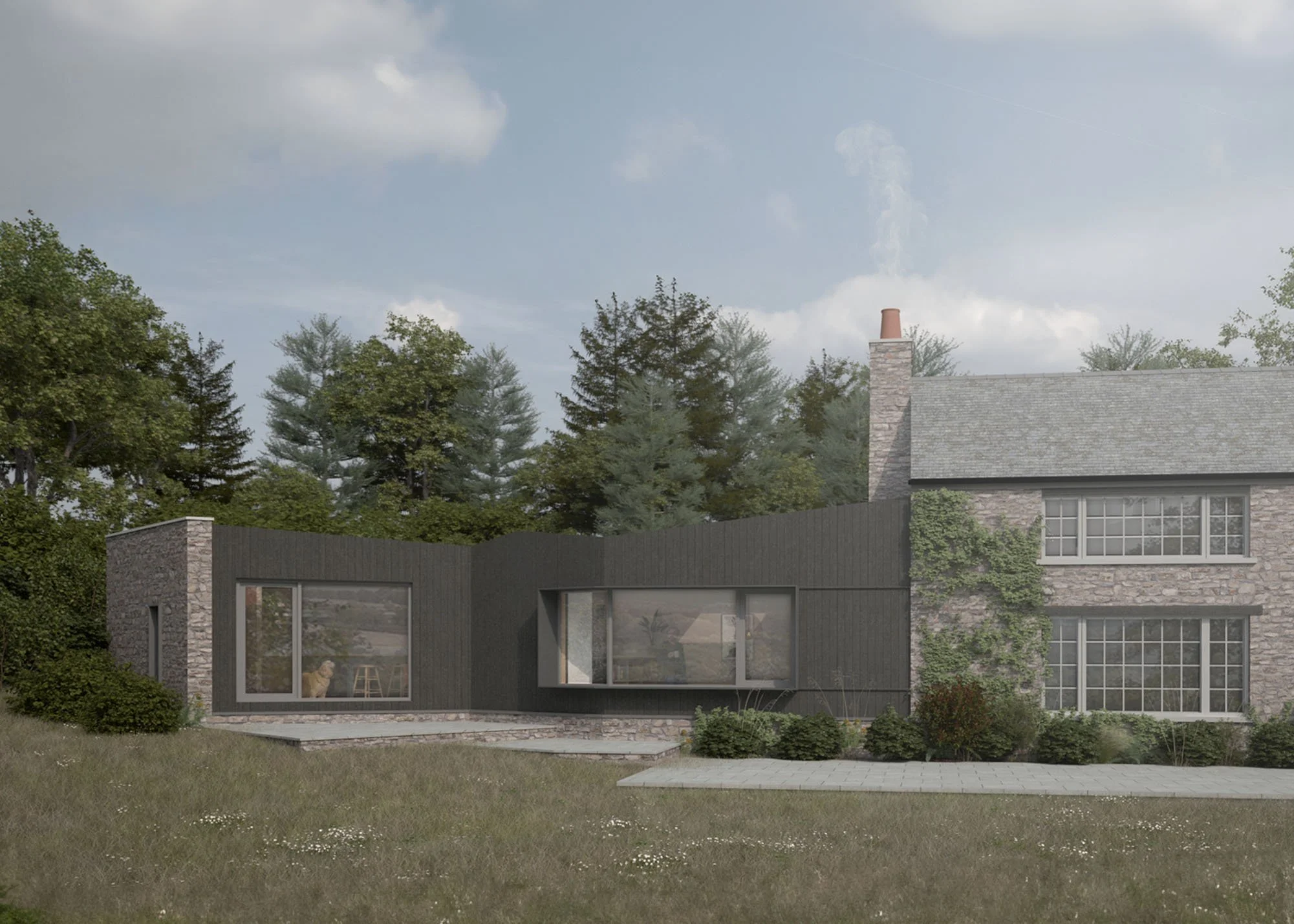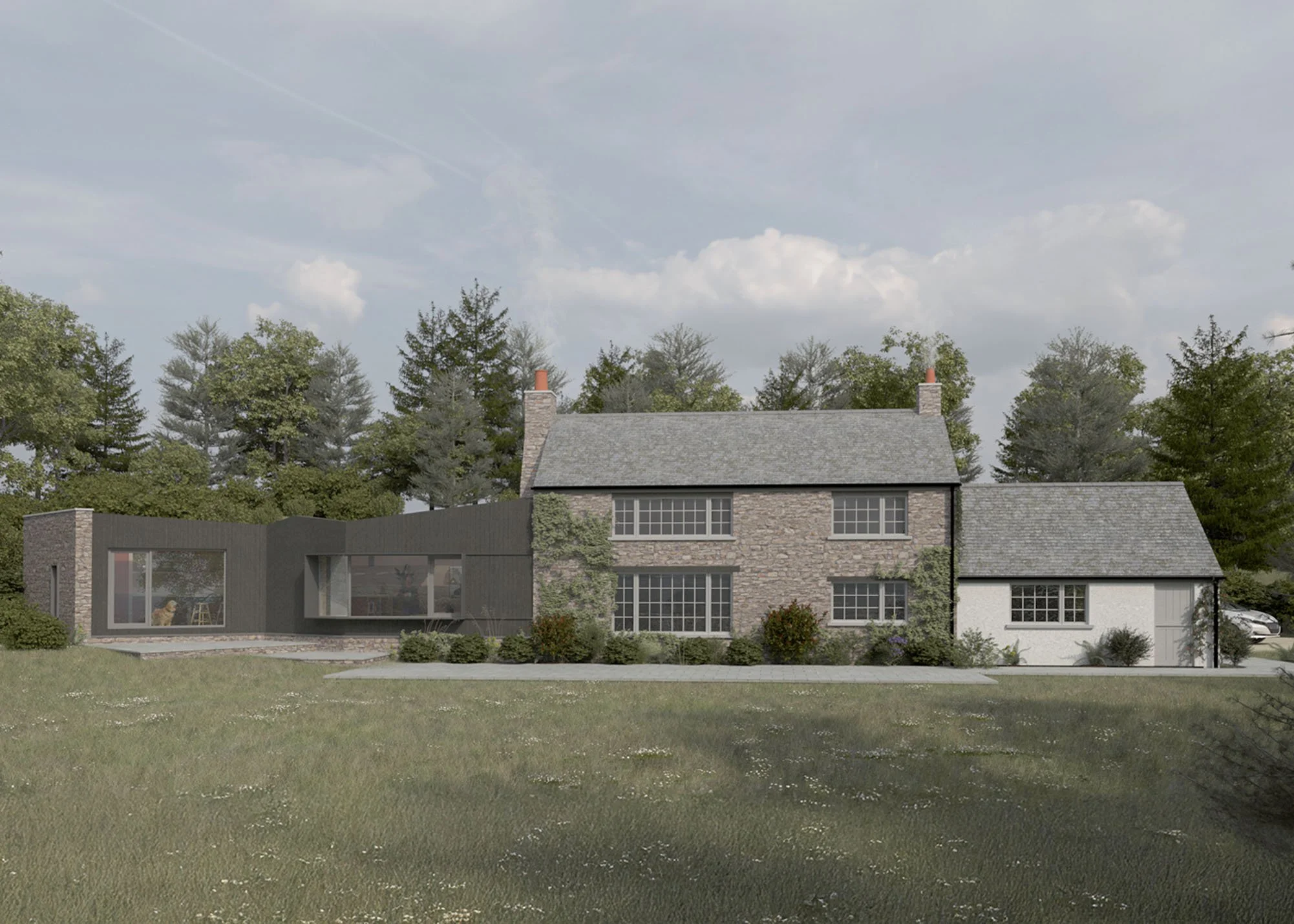 The proposal introduces a carefully calibrated shift in materiality and form — distinct from the original cottage yet deeply sympathetic to it. The cranked, single-storey extension sits alongside the traditional frontage, its stone walling and contemporary detailing creating coherence across a previously varied palette. Its placement is fundamental: oriented for long views, positioned for privacy, and shaped to welcome natural light throughout the day. The extension’s spatial alignment ensures a strong physical link to the existing hall, south-facing garden, and wider landscape. By unifying old and new, the scheme creates a renewed architectural language — one that respects the cottage’s heritage while allowing it to grow gracefully into its next chapter.