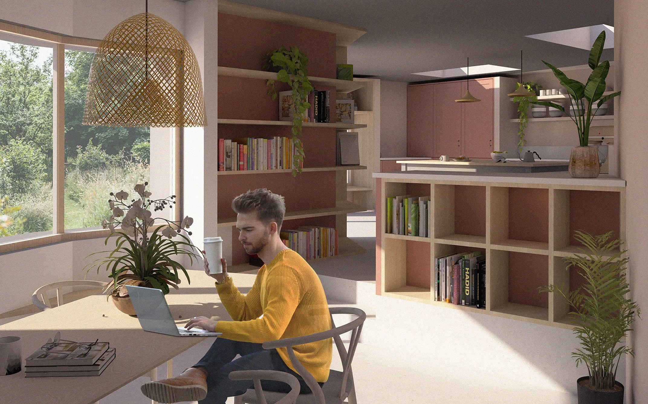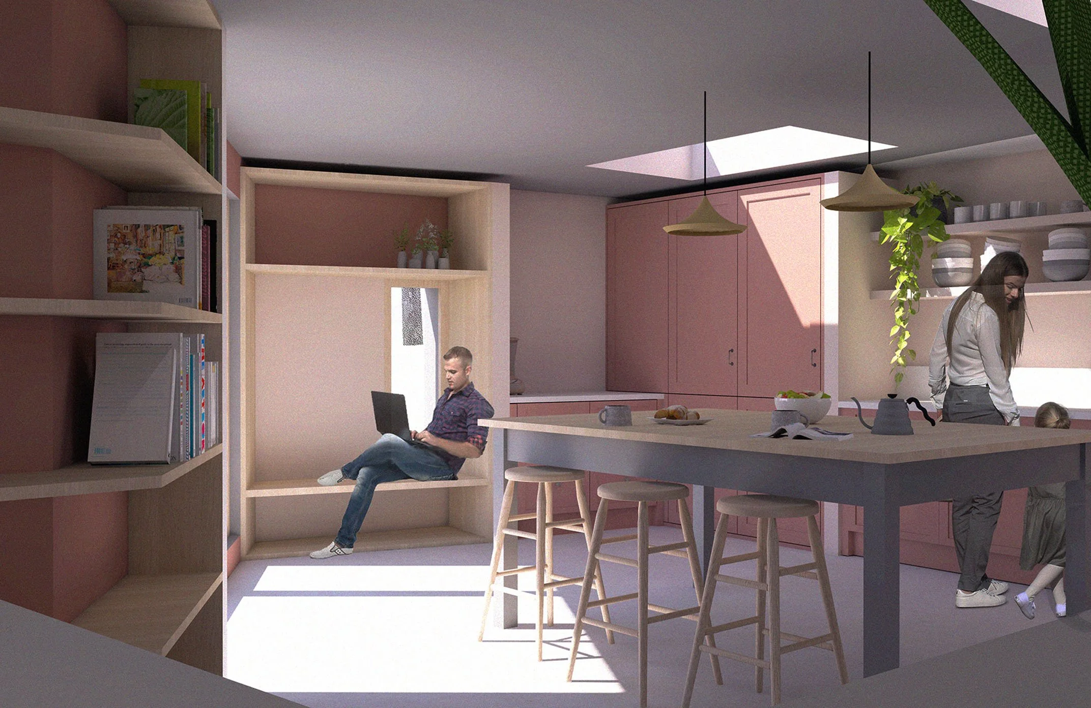 The cottage’s original character — its stone, render, and painted timber — has been sensitively enhanced, while unsympathetic later additions have been removed to allow the house to breathe again. A new single-storey extension, quietly contemporary in form, now holds the family kitchen and dining space, positioned to embrace daylight and sweeping views into the valley. A solid stone wall creates a protective edge to the lane above, with elevated floor levels offering a sense of refuge and prospect. Small peephole openings invite subtle glimpses outward, and a new pedestrian entry point allows the home to be approached with greater ease and intention. Inside, a reconfigured staircase frees the living room and leads to an additional first-floor bedroom, where new and traditional dormers marry past and present with quiet confidence.