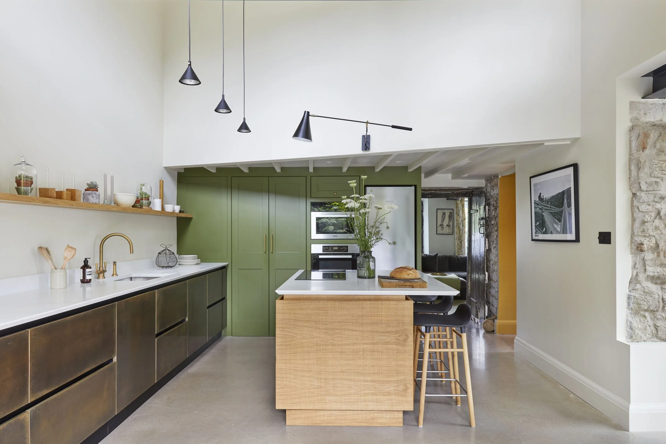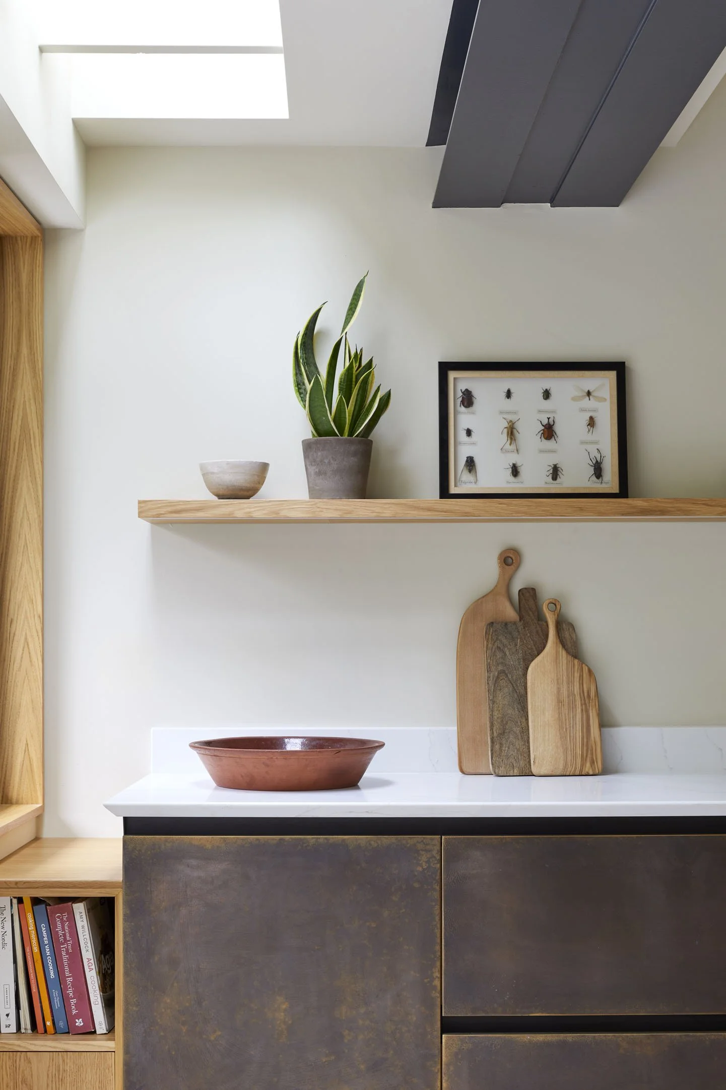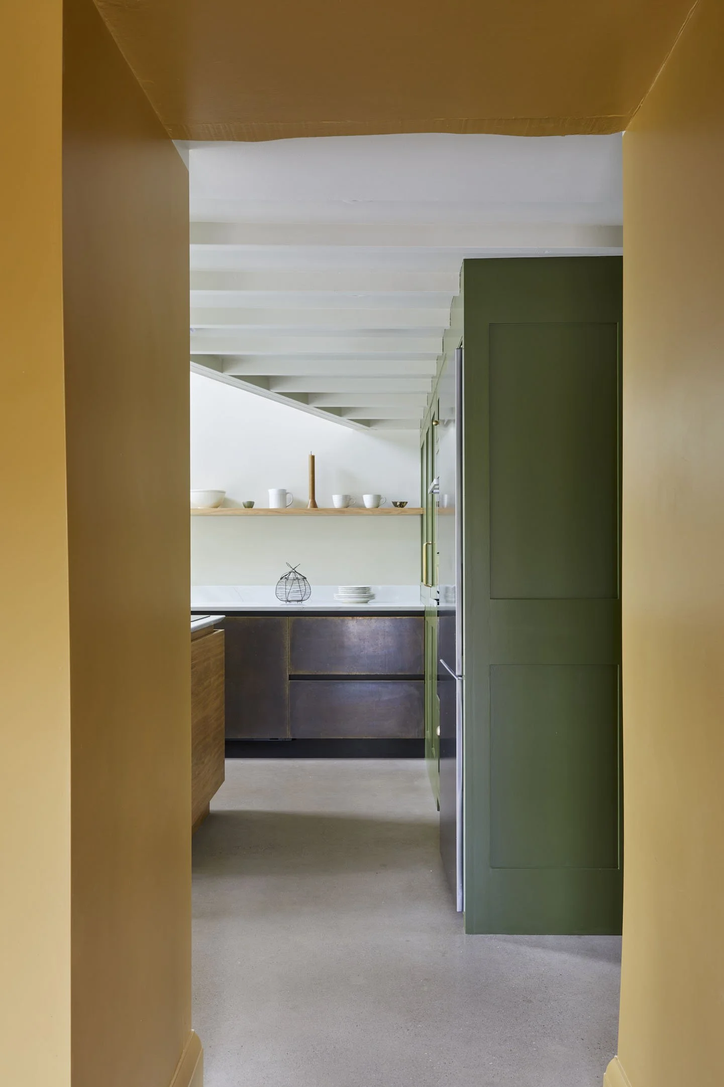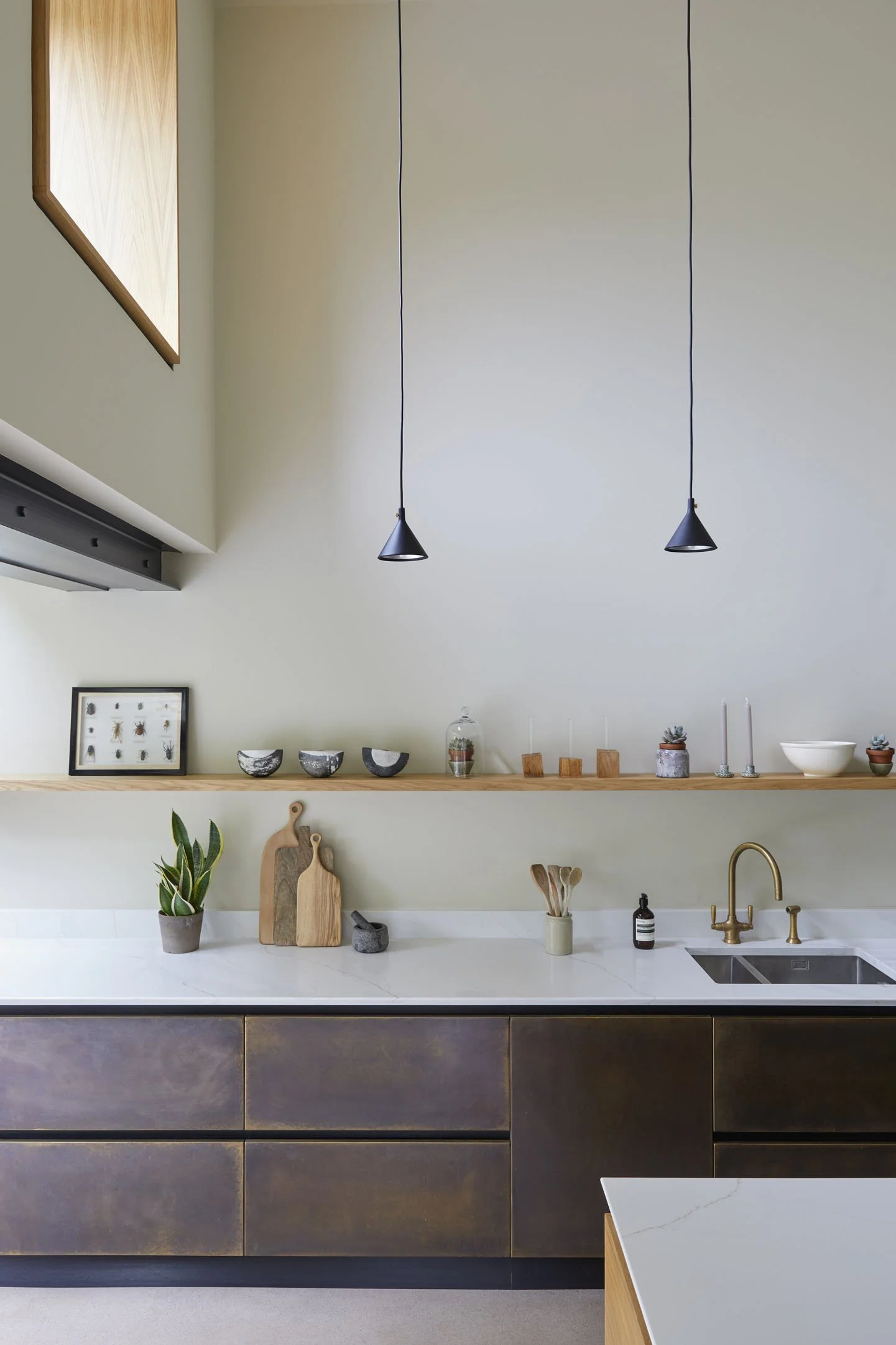 A mezzanine level above the kitchen introduces height and volume into the heart of the home, creating a moment of architectural lift that contrasts beautifully with the intimacy of the original cottage rooms. Level access to the courtyard and terrace further anchors the new spaces in the landscape, inviting effortless movement between indoors and out.