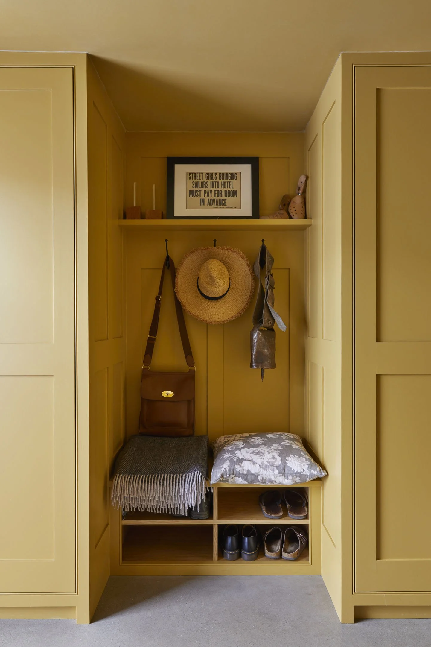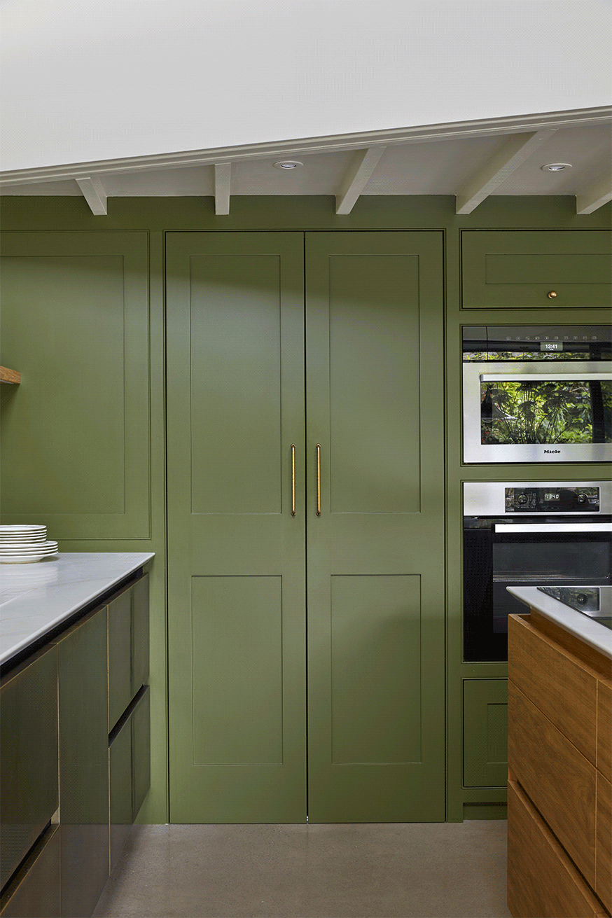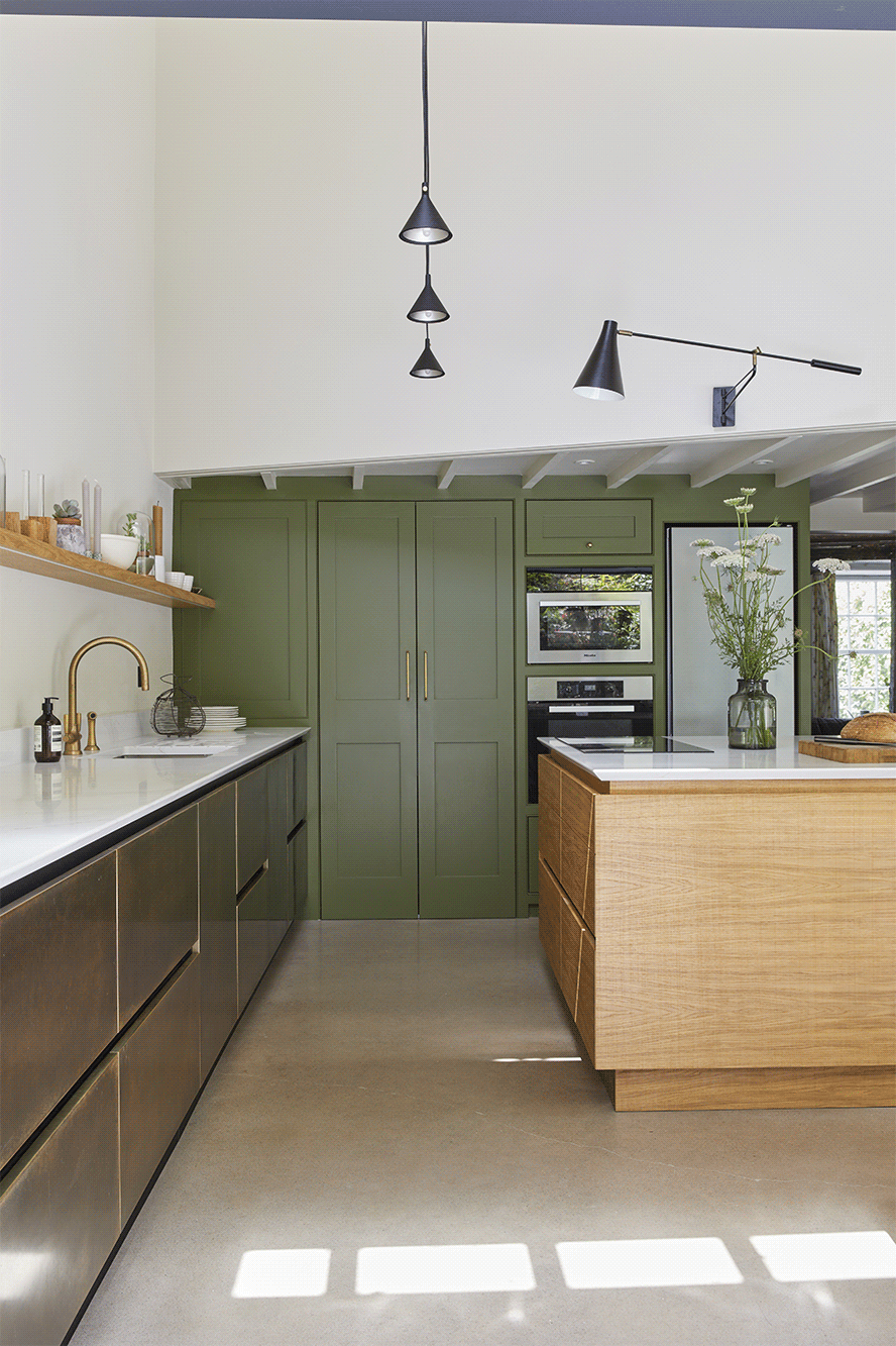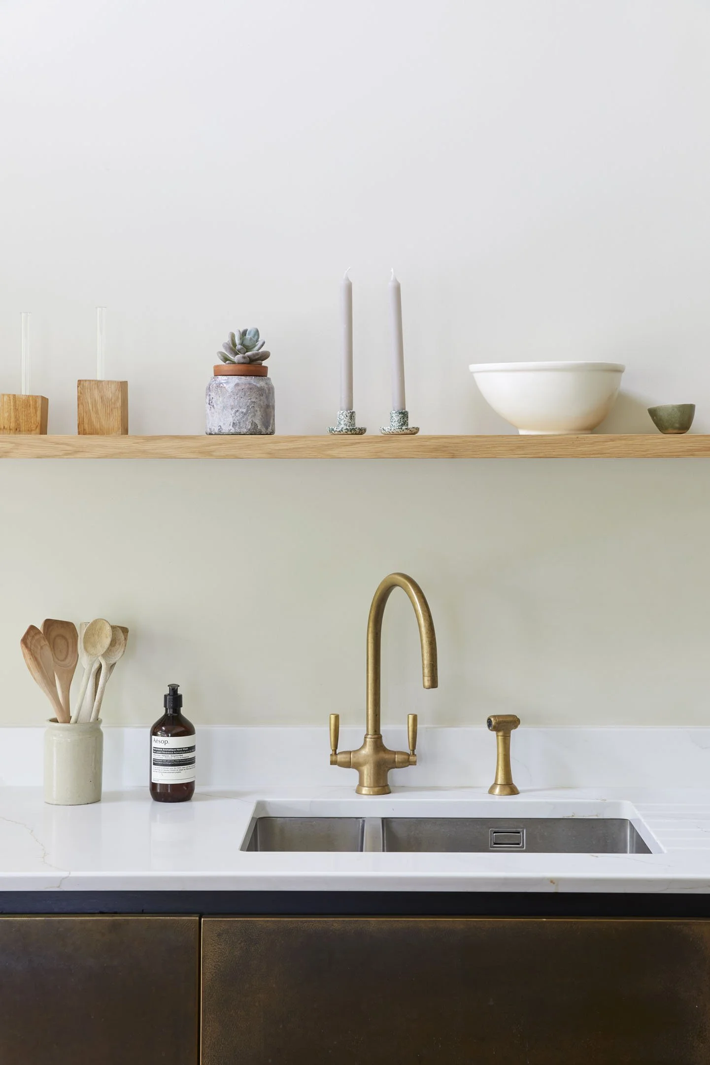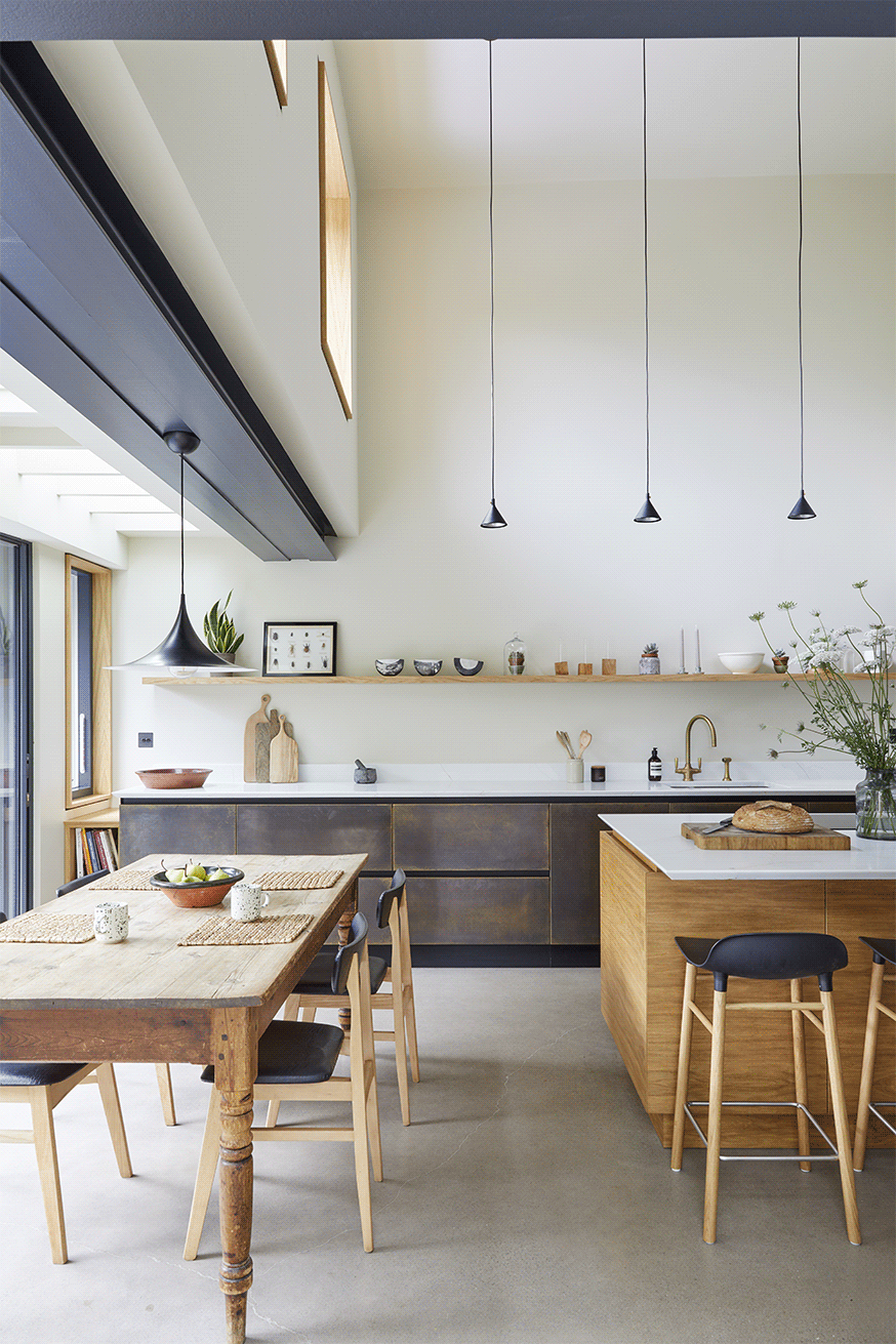 A mezzanine level above the kitchen introduces height and volume into the heart of the home, creating a moment of architectural lift that contrasts beautifully with the intimacy of the original cottage rooms. Level access to the courtyard and terrace further anchors the new spaces in the landscape, inviting effortless movement between indoors and out.