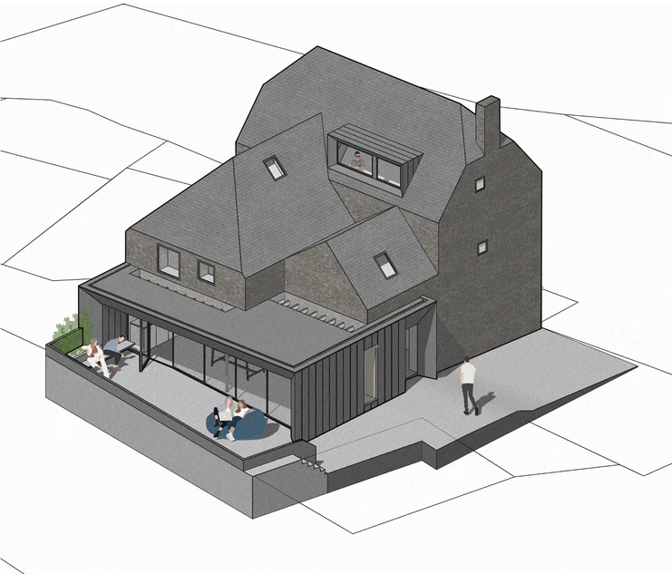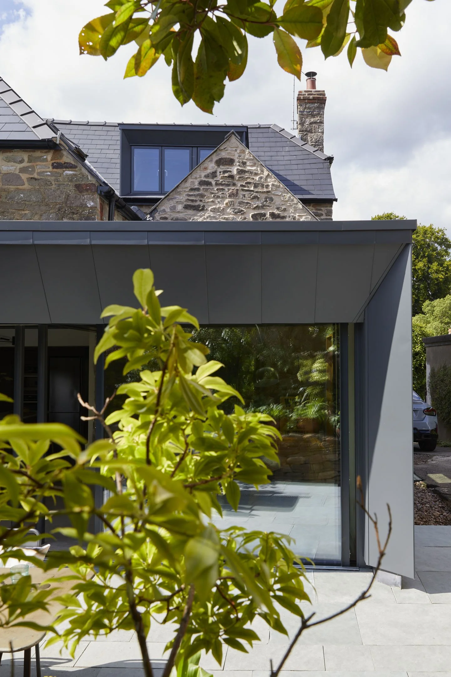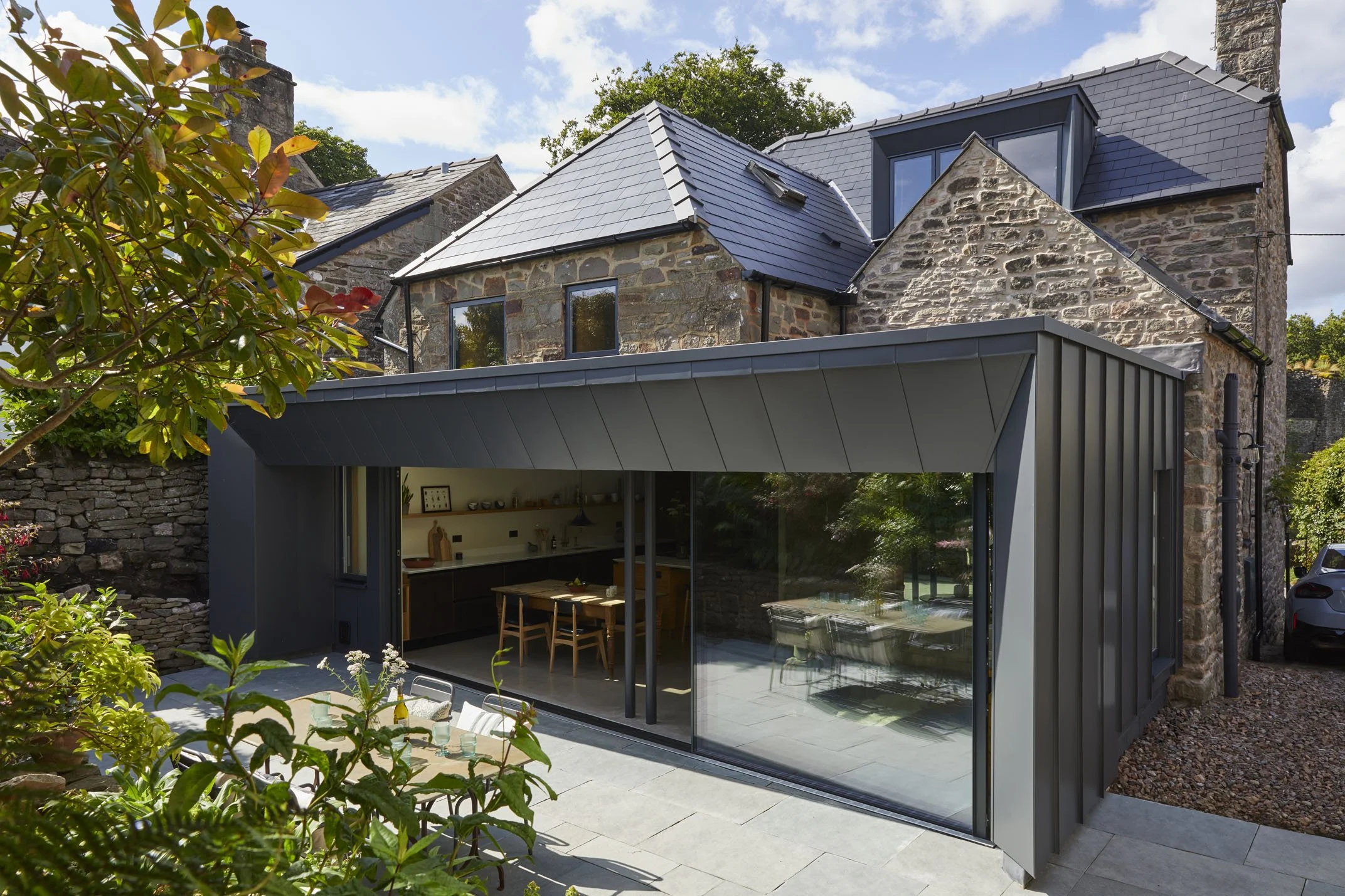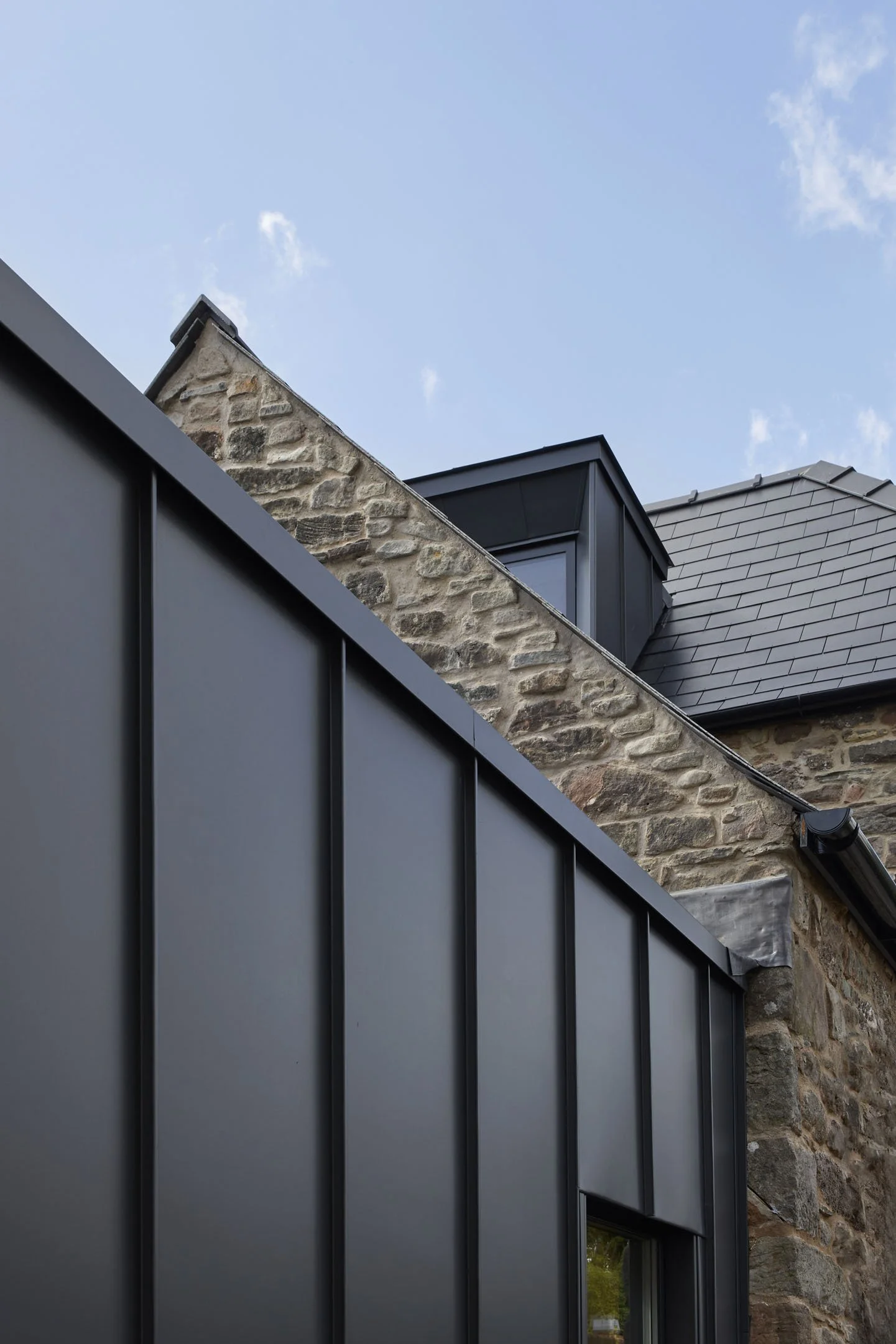 The extension is conceived as a refined counterpoint to the Grade II listed fabric. Clad in zinc with crisp detailing and a measured, low-lying form, it sits quietly behind the cottage — distinct yet respectful. The new structure contrasts intentionally with the existing stone, allowing the historic building to retain its character while the extension introduces a contemporary language of lightness and precision. High-performance glazing opens the rear elevation, bringing daylight deep into the plan and offering uninterrupted views to the courtyard. Internally, the double-height mezzanine space adds spatial drama while maintaining a sense of warmth and human scale. Material choices were guided by longevity, sustainability, and contextual sensitivity, resulting in a modern intervention that enhances energy efficiency and durability without compromising heritage value. Through careful siting, crafted proportions, and a harmonious interplay of old and new, The Moat House becomes a home that feels both renewed and timeless — deeply rooted in its valley setting while confidently embracing the future.